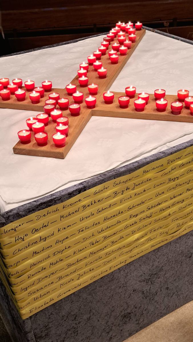 Ein sichtbares Zeichen des Erinnerns war ein gelbes Band am Altar, auf dem die Namen der Verstorbenen verzeichnet waren. Angehörige hatten zudem die Möglichkeit, eine Kerze zu entzünden und so in einem persönlichen Moment Abschied zu nehmen und zu gedenken.